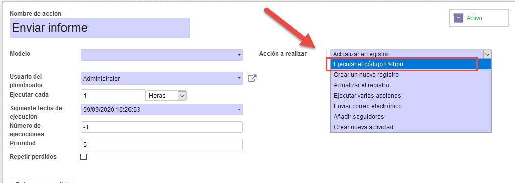 Vamos a Técnico -> Automatización -> Acciones Planificadas y creamos una nueva acción planificada
