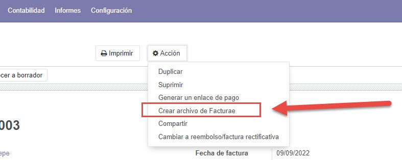 Con esto ya tienes casi todo. Si ahora haces una factura a un cliente, una vez realizada, en la parte de arriba despliegas Acción y verás que te sale la posibilidad de Crear archivo de Facturae, como en la foto siguiente: