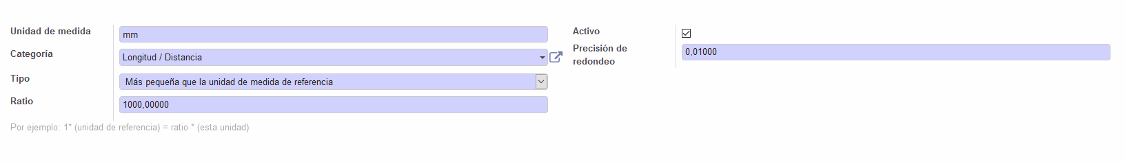 Y aquí creamos nuestra Unidad de Medida, deberemos asignarle el nombre, y a qué categoría pertenece, en este caso hacemos el MilíMetro (mm), que corresponde a la categoría de Longitud/Distancia, el Tipo es más pequeño que la MR, y en Ratio asignamos cuanto más pequeño és, que en nuestro caso es 1000: